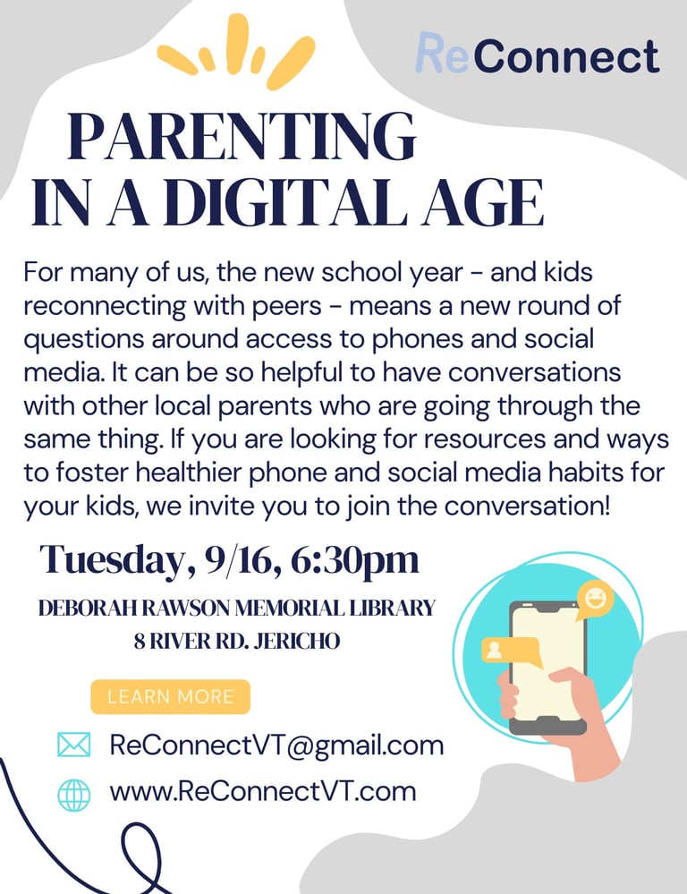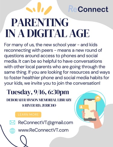 ReConnect started as a group of families in Jericho and Underhill, Vermont looking to build community and share resources about the issue of healthier phone and social media habits for our kids. We aim to give our children the kind of childhood we experienced – one where kids play together, resolve challenges face to face, and live life in person. The movement is growing; see local newsletter sign-ups below!